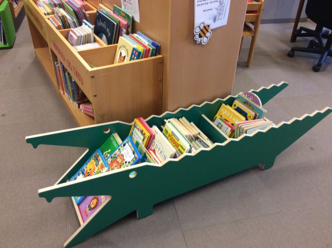 Þennan flotta bókakassa má finna á Bókasafni Fjallabyggðar (Siglufirði) og eru krakkarnir alsælir með nýja vininn. Yngstu börnin geta sótt sér bækur alveg sjálf án hjálpar.